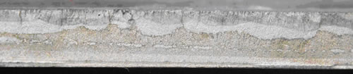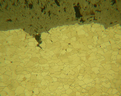 Polished micro section of a failed boiler tube showing grain boundaries and crack propagation.