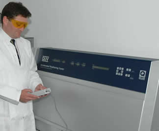 Because the intensity and the output of the bulbs change with time the irradiance needs to be continually monitored or the bulbs cycled and changed at regular intervals. Materials Technology utilises the newest types of machines fitted with continual solar irradiance monitoring and control (solar eye). This provided superior and more reproducible results when compare to the older style machines that rely on bulb cycling.