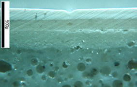 Micro section through paint layersGlass reinforced plastic (GRP) is commonly used in boat construction and so we have come across many cases where problems have arisen. In this case, ripples were forming in the GRP outer skin of a sandwich panel hull. The expanded foam coring was scored to allow it to be bent to shape, and epoxy resin had leached into the slits. In this case we undertook thermal modeling to show that the temperatures reached in the hull in direct sunlight exceeded the glass transition temperature of the resin. At this temperature, the resin becomes soft and pliable. Laboratory tests suggested that the resin in the face sheets had not been correctly mixed, and so when the hull became hot, the resin in the core slits expanded, deforming the partially softened face sheets. As these heating and cooling cycles progressed, the face sheets continued to cure, locking the deformations in place .