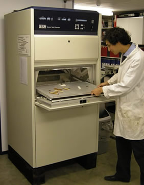 Because the intensity and the output of the bulbs change with time the irradiance needs to be continually monitored or the bulbs cycled and changed at regular intervals. Materials Technology utilises the newest types of machines fitted with continual solar irradiance monitoring and control (solar eye). This provided superior and more reproducible results when compare to the older style machines that rely on bulb cycling.