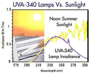 Fluorecent bulb type machines often have a variety of bulbs to select from which give various different outputs. The most common bulb type is referred to as the type A bulb. This is more correctly known as the UVA340 bulb. This should not be confused with the UV A part of the solar spectrum (see more about solar spectrum under the learn more tab). This bulb type very accurately reproduces the UV portion of the solar spectrum from about 300-390 nm. For this reason the fluorescent bulb type test is one of the most accurate in this region.